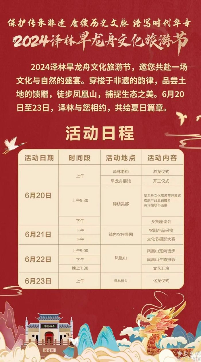 為了傳承這一國家級非遺,助推“澤林旱龍舟文化旅游品牌”的建設(shè),今年已是澤林鎮(zhèn)舉辦“澤林旱龍舟文化旅游節(jié)”的第四個(gè)年頭。澤林鎮(zhèn)始終堅(jiān)持進(jìn)一步深挖文化魅力,堅(jiān)定走好“以商養(yǎng)文、以文促商、文商互益”的文商融合發(fā)展新路子。