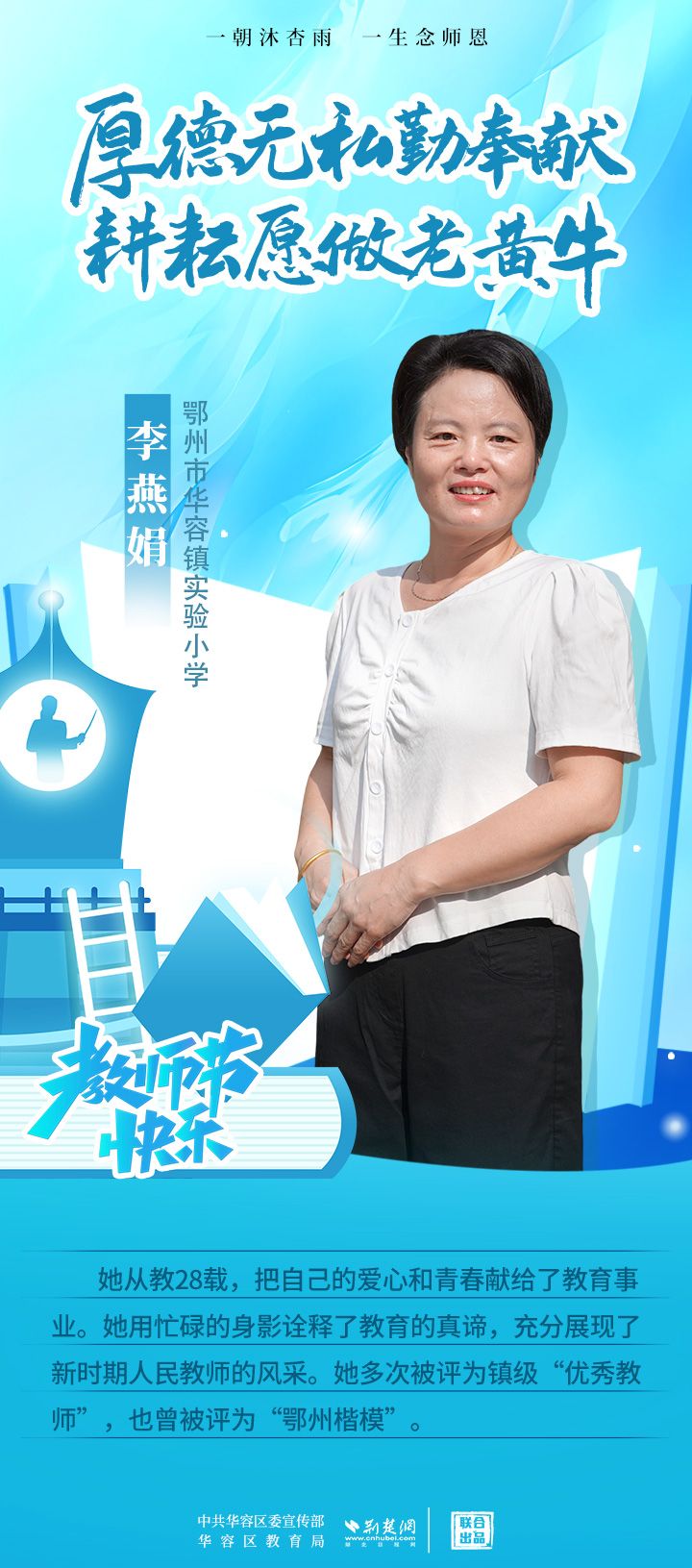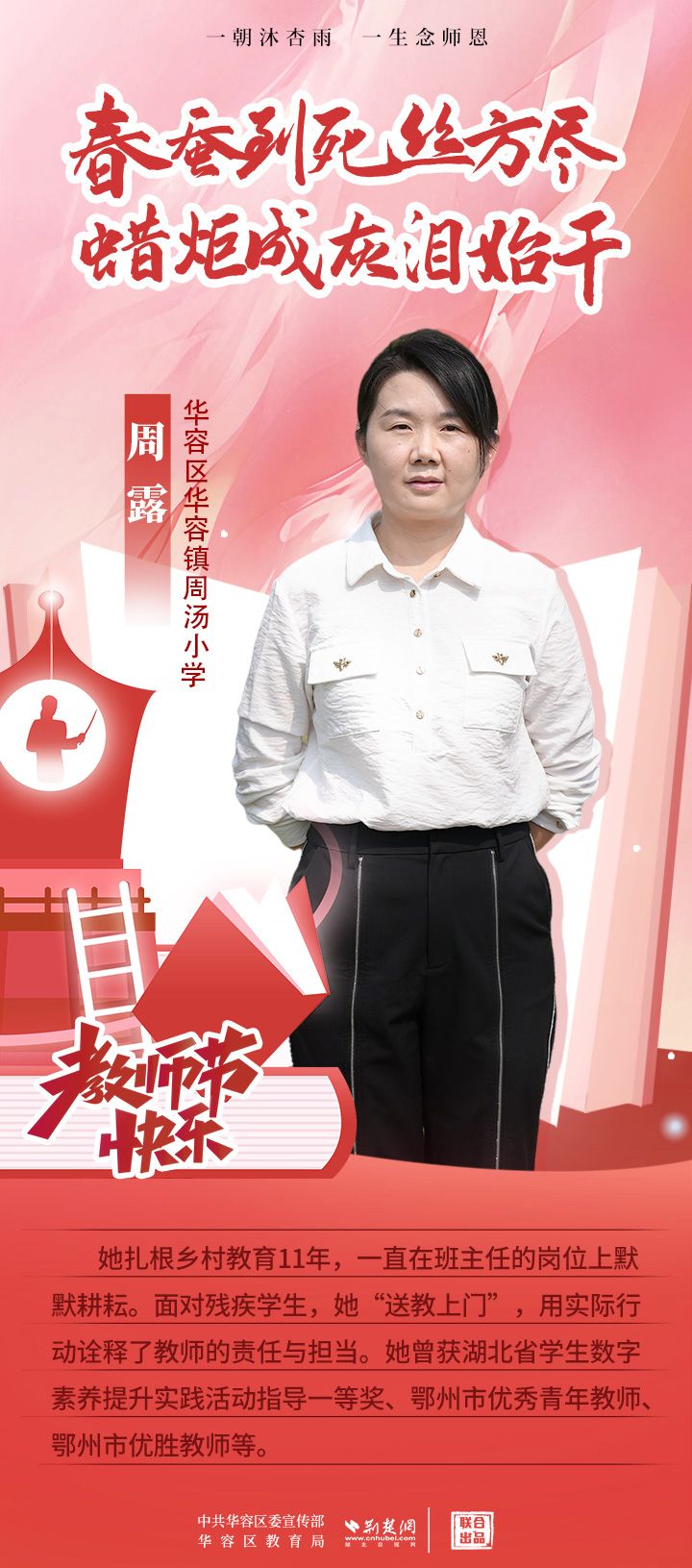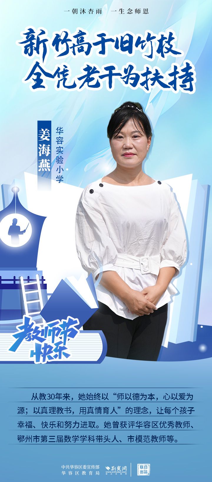 荊楚網(wǎng)(湖北日報(bào)網(wǎng))訊(記者 劉璐 通訊員 張曉琴)百年大計(jì),教育為本;教育大計(jì),教師為本。在教師節(jié)來臨之際,中共華容區(qū)委宣傳部聯(lián)合荊楚網(wǎng)(湖北日報(bào)網(wǎng))推出創(chuàng)意海報(bào),姜海燕、廖進(jìn)等6名老師入選“荊楚好老師”群星計(jì)劃。她們?彰顯了新時(shí)代教師的風(fēng)采,?為教育事業(yè)的發(fā)展貢獻(xiàn)了重要力量?,向了不起的她們致敬!