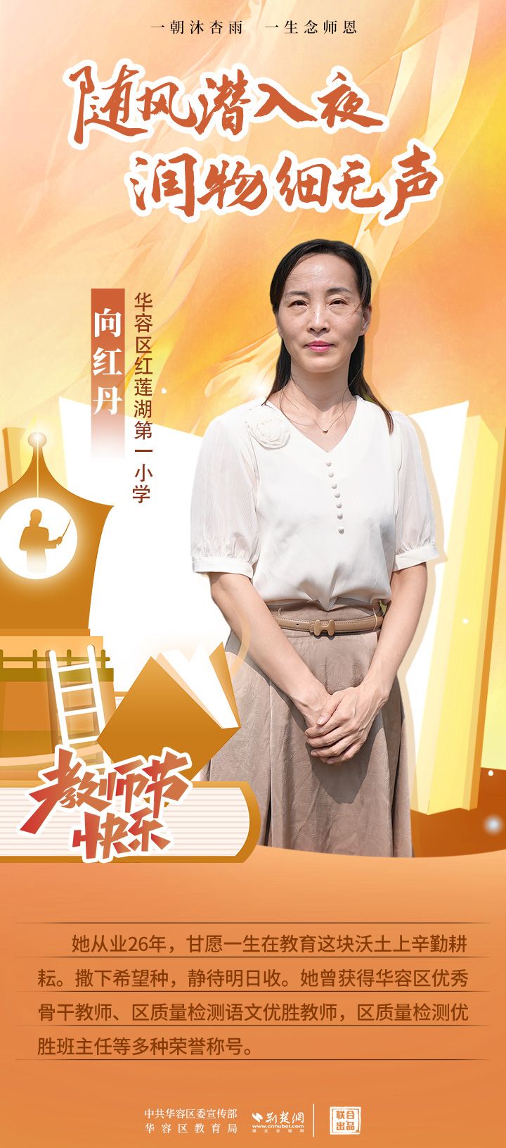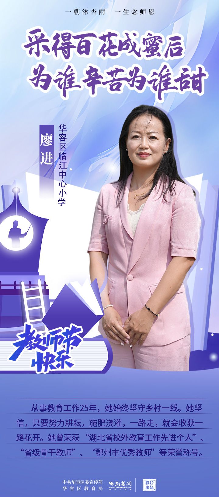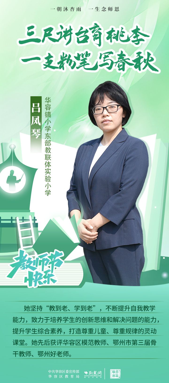 荊楚網(wǎng)(湖北日報(bào)網(wǎng))訊(記者 劉璐 通訊員 張曉琴)百年大計(jì),教育為本;教育大計(jì),教師為本。在教師節(jié)來臨之際,中共華容區(qū)委宣傳部聯(lián)合荊楚網(wǎng)(湖北日報(bào)網(wǎng))推出創(chuàng)意海報(bào),姜海燕、廖進(jìn)等6名老師入選“荊楚好老師”群星計(jì)劃。她們?彰顯了新時(shí)代教師的風(fēng)采,?為教育事業(yè)的發(fā)展貢獻(xiàn)了重要力量?,向了不起的她們致敬!