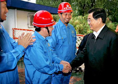 8時48分,胡錦濤一行乘車來到天興洲大橋建設(shè)工地,鐵道部黨組書記、部長劉志軍代表工程建設(shè)者熱烈歡迎總書記來建設(shè)工地考察。他說,今天,是中國鐵路人最難忘的日子。在我們興建世界一流的公鐵兩用橋的時候,總書記來到建設(shè)工地,這是對中國鐵路人的極大關(guān)懷。我代表220萬鐵路員工,也代表參加大橋建設(shè)的全體工程技術(shù)人員和職工,向總書記表示,一定通過這次總書記考察,把中國鐵路的工作做得更好,把中國鐵路的建設(shè)搞得更好,把天興洲大橋建設(shè)成世界一流的現(xiàn)代化大橋。