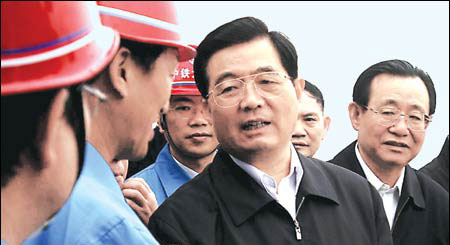 中共中央總書記胡錦濤察看天興洲大橋工程概況