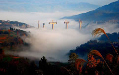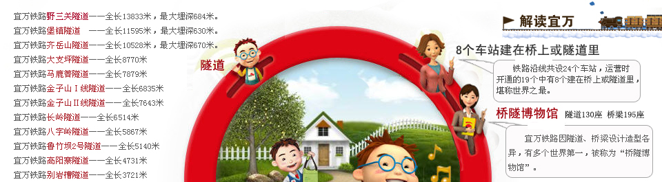 宜萬鐵路被稱為“橋隧博物館”。全線共有隧道159座(其中一級風(fēng)險(xiǎn)隧道8座,二級風(fēng)險(xiǎn)隧道26座),其中10公里以上隧道5座,總長338.7公里;全線有橋梁253座,總長69.64公里,其中特殊結(jié)構(gòu)橋梁29座,涵洞600多座;正線橋隧占線路總長的74%。據(jù)中鐵四局宜萬指揮部人士稱,宜萬鐵路的橋隧占比為世界之最。