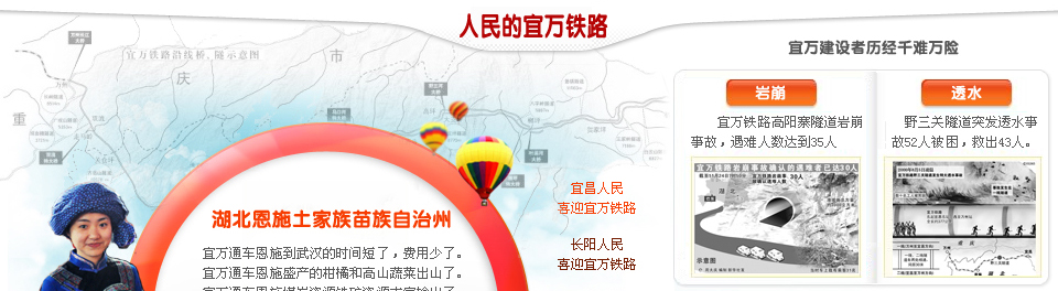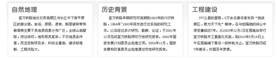 宜萬鐵路因穿越喀斯特地貌地區(qū),被譽(yù)為我國鐵路史上施工難度最大的山區(qū)鐵路工程。它集“西南山區(qū)鐵路艱險(xiǎn)之大成”,專家們稱之為“筑路禁區(qū)”。修建難,最難在隧道。宜萬鐵路的159座隧道中有70%位于石灰?guī)r地區(qū)。在中國鐵路建設(shè)史上,因?yàn)橐巳f鐵路,第一次為鐵路隧道按風(fēng)險(xiǎn)分為輕、中、高3個(gè)等級。
