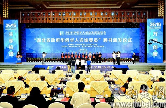 圖為:昨日上午,2016年“華創(chuàng)會(huì)”在武漢東湖國(guó)際會(huì)議中心開幕。圖為“湖北省政府華僑華人咨詢委員”聘書頒發(fā)儀式現(xiàn)場(chǎng)。...">